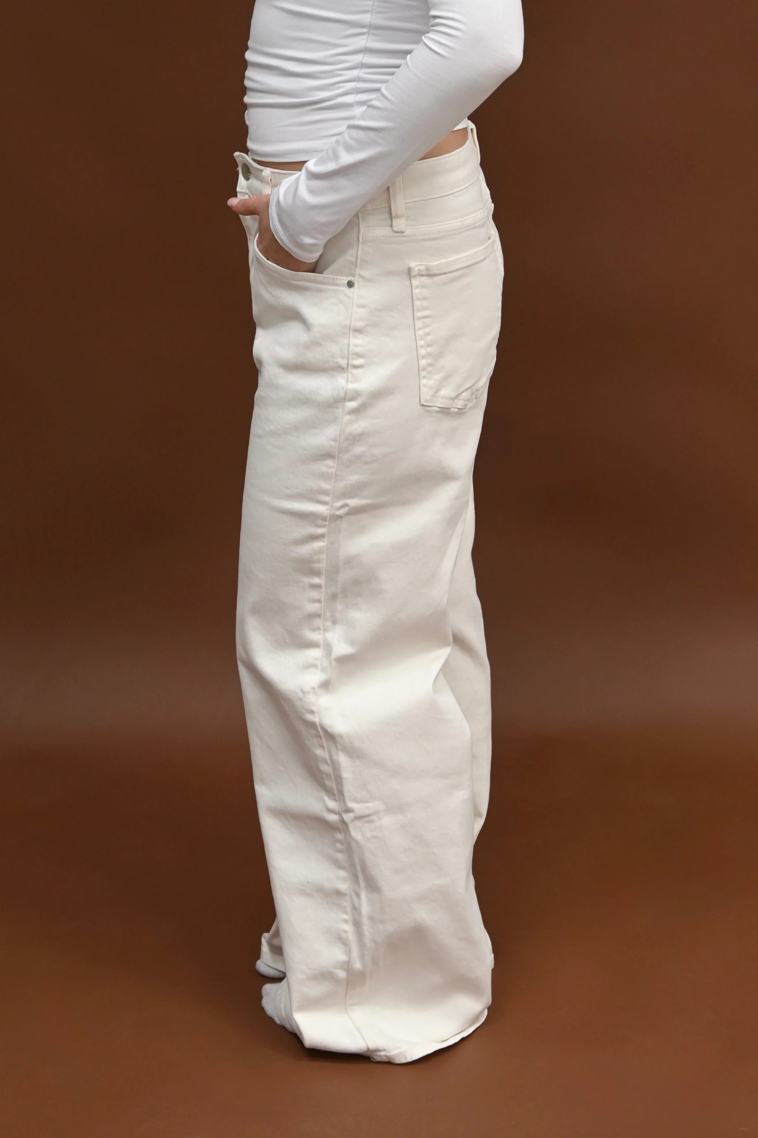 Calm wide leg jeans crème met rechte wijde pijpen en fijne taille. Makkelijk te combineren en zit lekker. Voor 23:00 besteld, dezelfde dag verzonden.