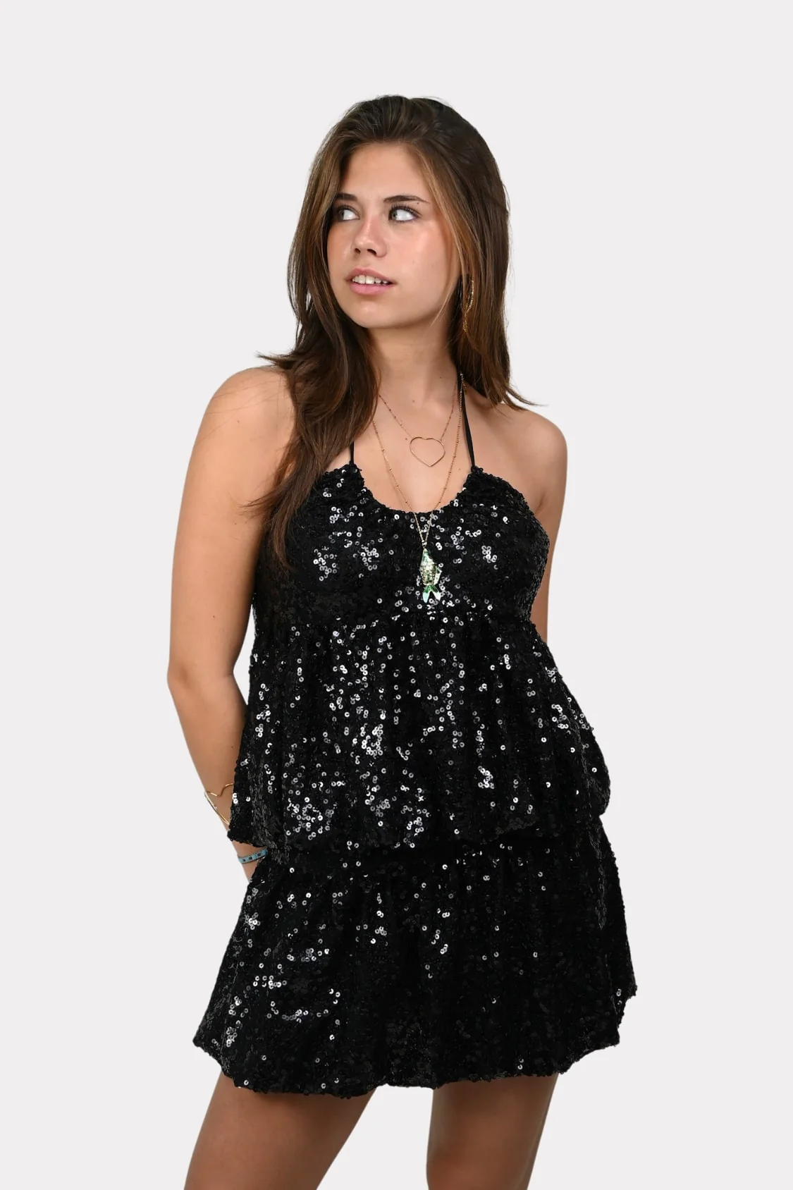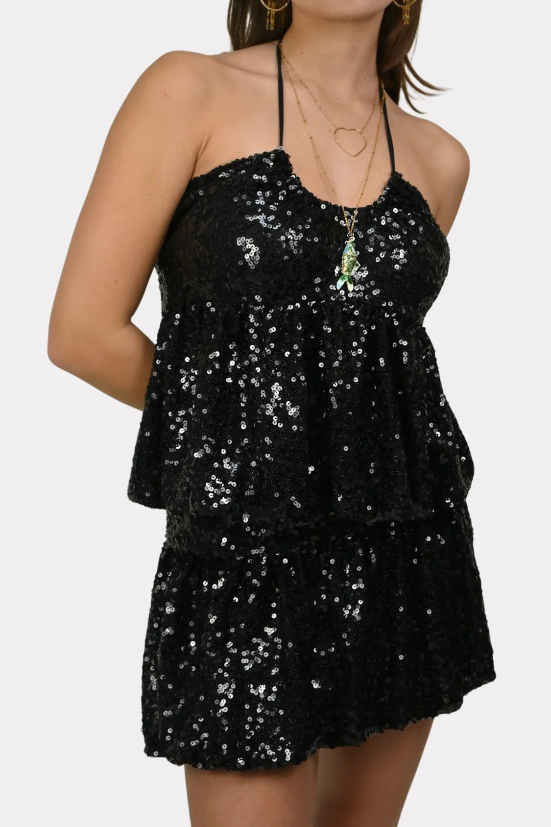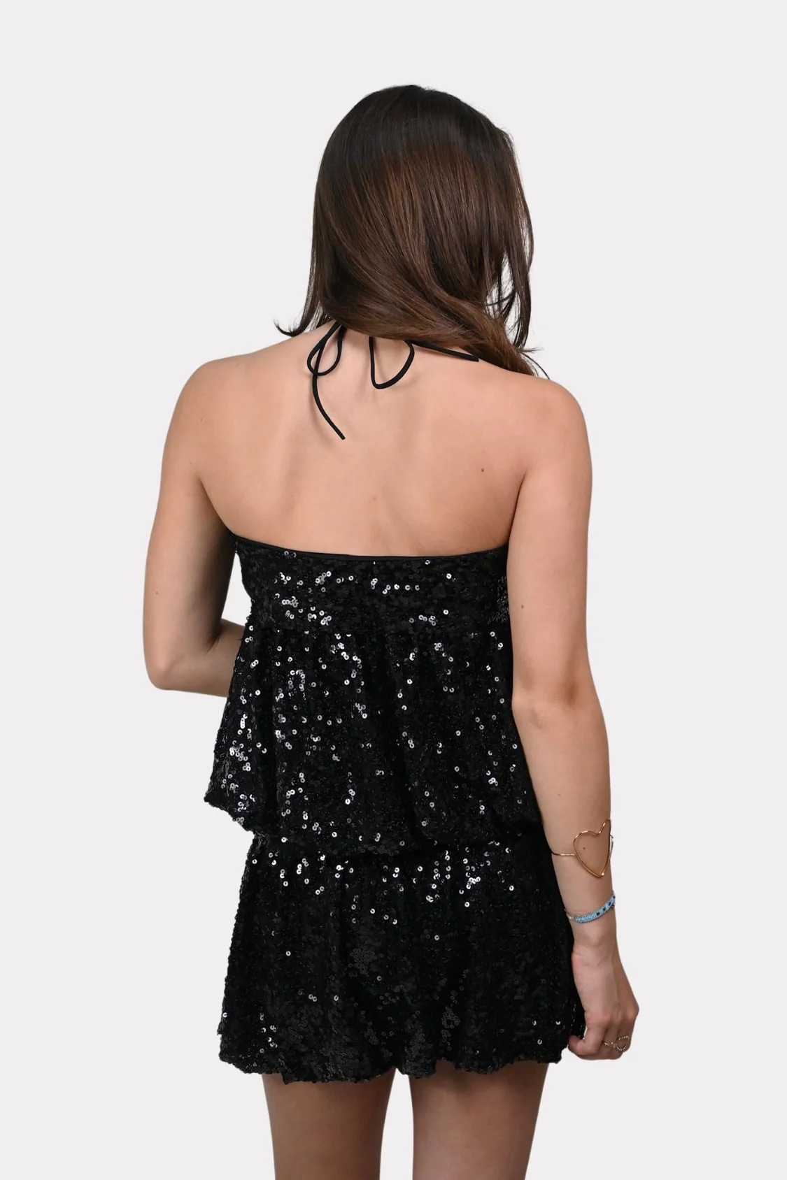 De Forever Young top is zo’n item waar je meteen vrolijk van wordt. De hele top is bedekt met kleine zwarte pailletten die je echt laten opvallen. Het model heeft een halternek met dunne bandjes en een luchtig vallende pasvorm waardoor het lekker zit en niet te strak is. De lichte plooien geven de top een speels effect